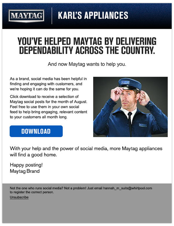 Karl’s appliances is a campaign to generate Maytag brand awareness for their customers to use within a social media platform.